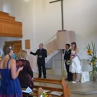 목사님이 이렇게 주례를 서주고, 초를 켜고, 반지를 나누고 축가를 부르고 신랑 신부는 저 의자에 앉아서 결혼식을 진행했습니다.